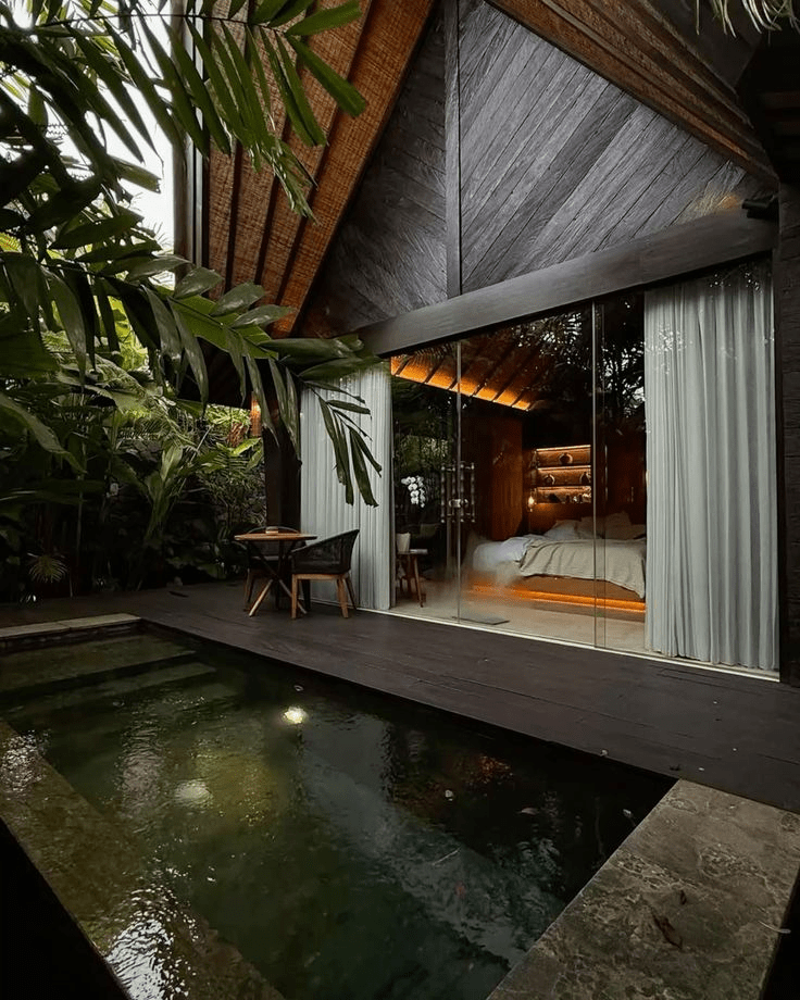 Jasa desain rumah konsep resort dengan kolam renang menjadi salah satu desain yang paling populer. Jasa desain rumah konsep resort jenis ini menghadirkan kolam renang sebagai pusat area relaksasi sekaligus elemen estetika yang memperkuat nuansa resort. Kolam renang biasanya dipadukan dengan area deck kayu, taman tropis, serta kursi santai sehingga menciptakan suasana seperti resort mewah yang nyaman untuk bersantai bersama keluarga.